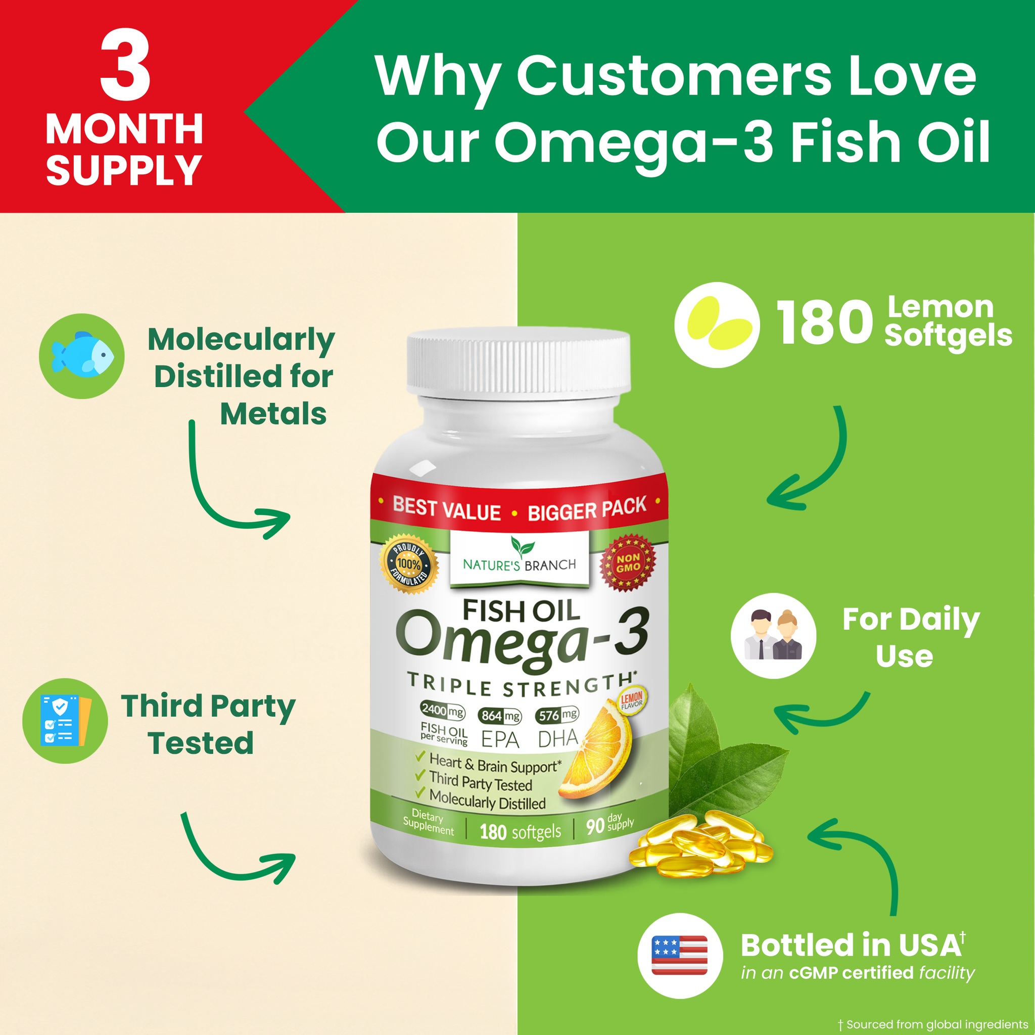 Our 3 month supply of Omega-3 Fish Oil is packed with 2,400mg of triple strength fish oil per serving. With a refreshing lemon flavor in easy-to-swallow burpless softgels, it delivers a potent 864mg EPA and 576mg DHA, promoting heart, brain and joint support.*